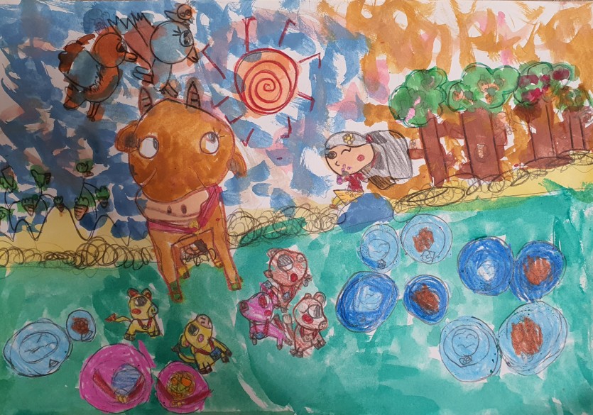 여자아이는 소들의 먹이를 챙겨 풀밭에 놓아준 모습입니다