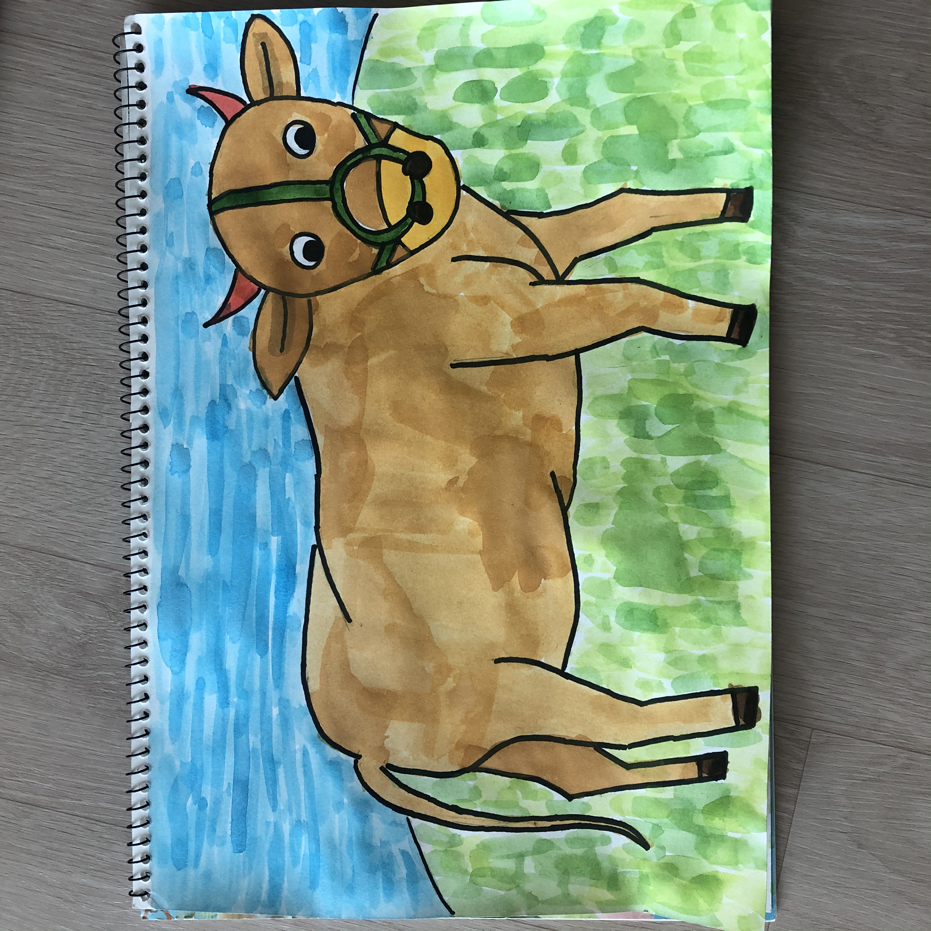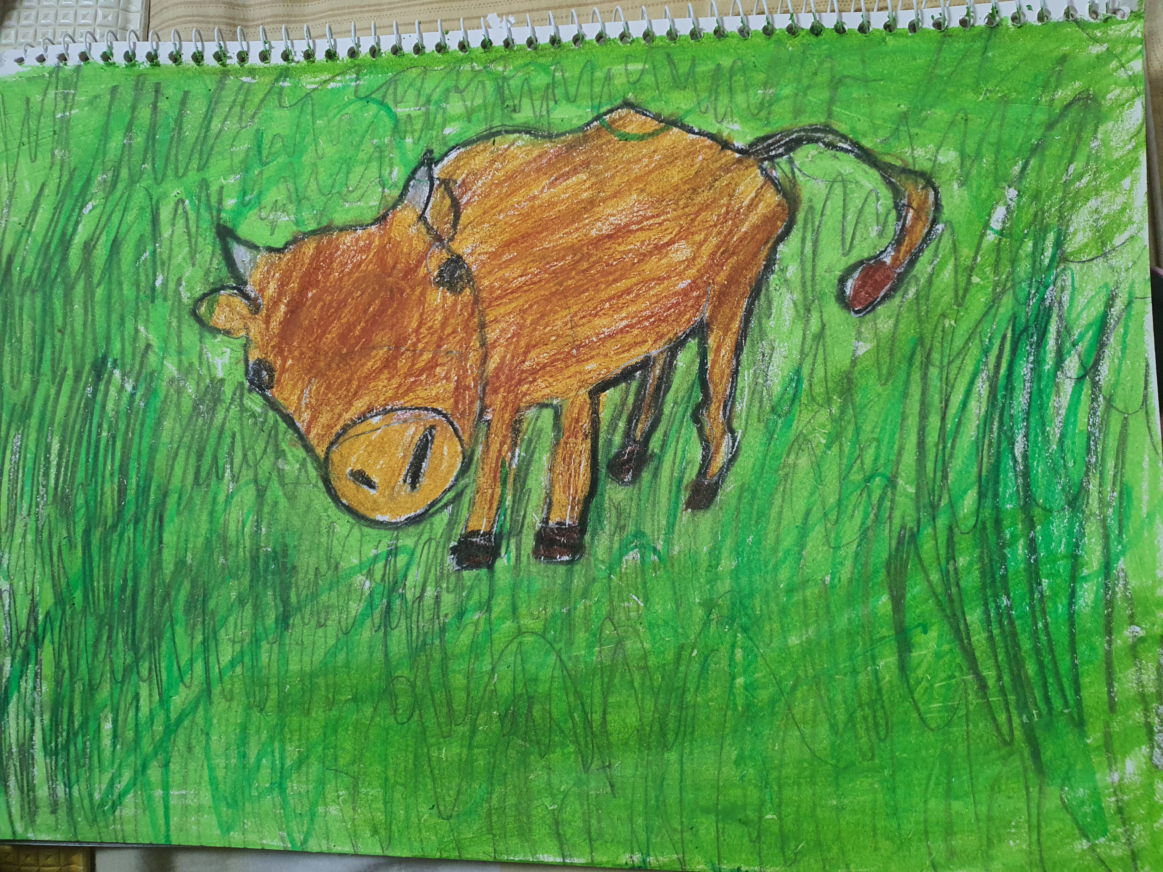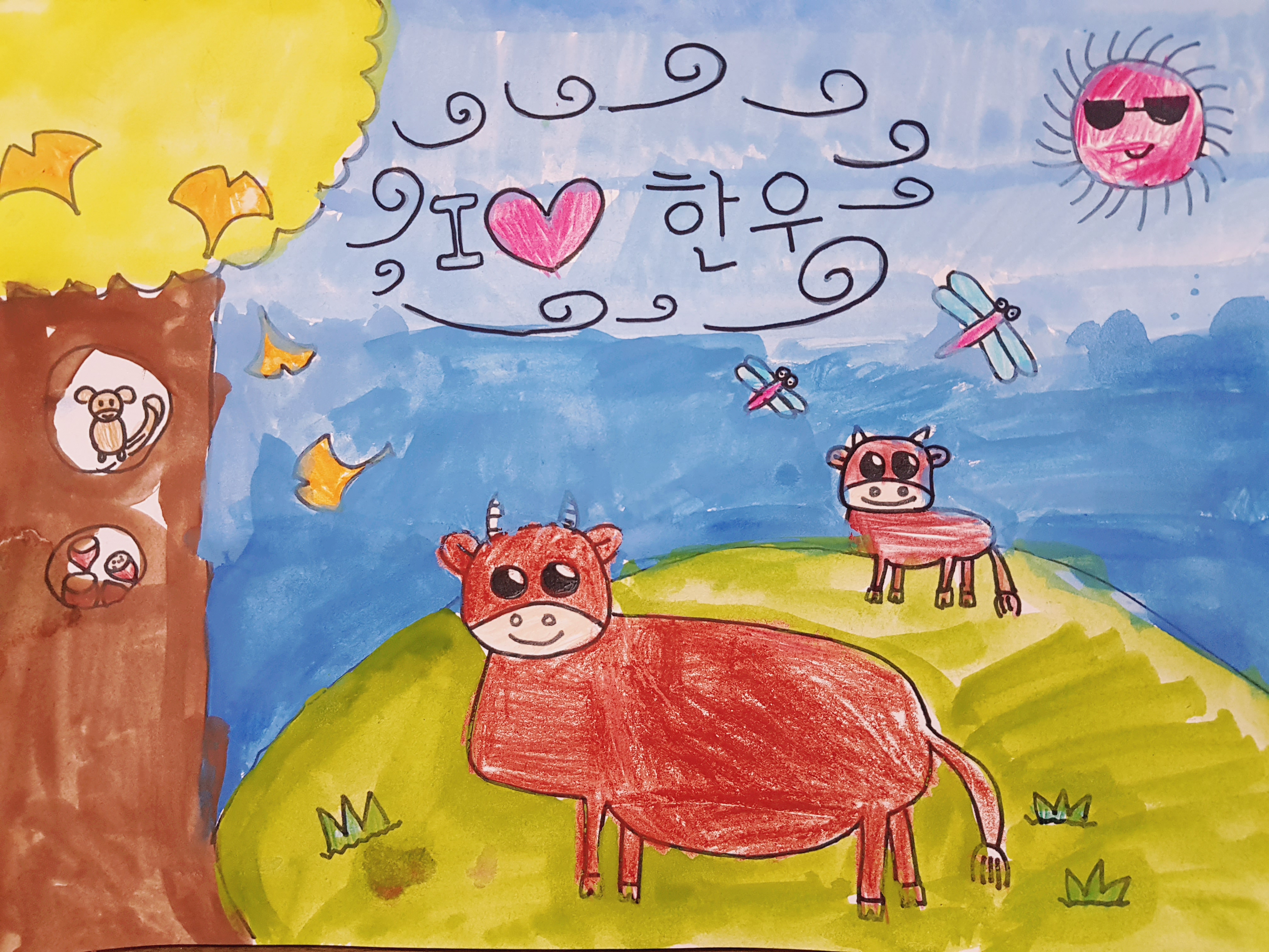 한우가 편안하게 앉아있는 모습을 그렸어요