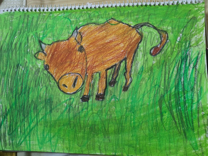 소가 좋아 하는 싱싱한 풀이 가득해서 너무 행복해 하는 소를 그렸어요