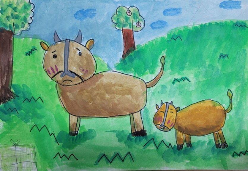 엄마소는 비올까봐 우울해하고. 아기소는 넓은벌판이라 놀수있는 마음에 기뻐하는 내용