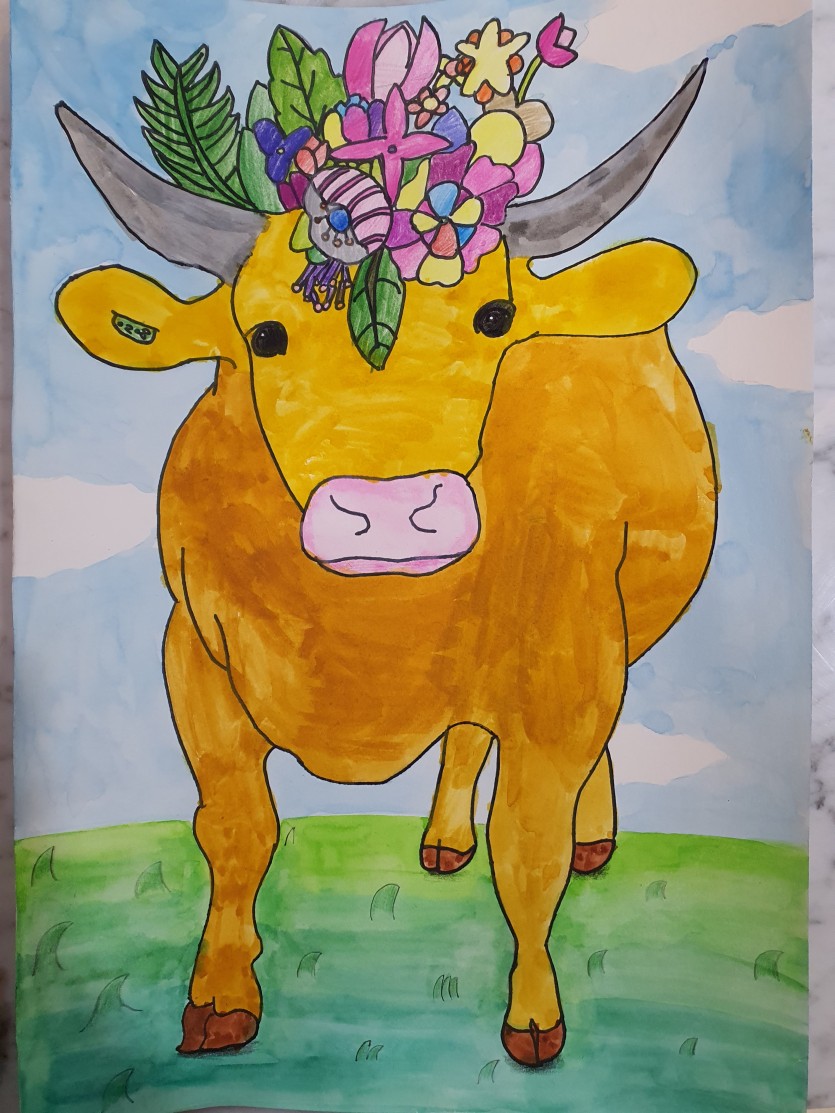 아름다운 한우가 머리에 꽃왕관을 쓰고 논에 서서 나(현서)를 보고있다~