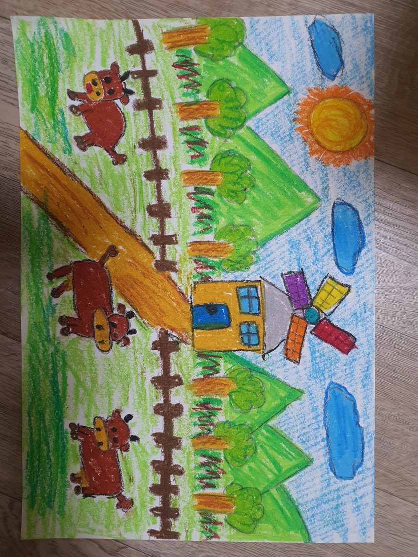 초록식물들과 따스한 햇살이 좋은 소들의 모습을 그렸습니다.