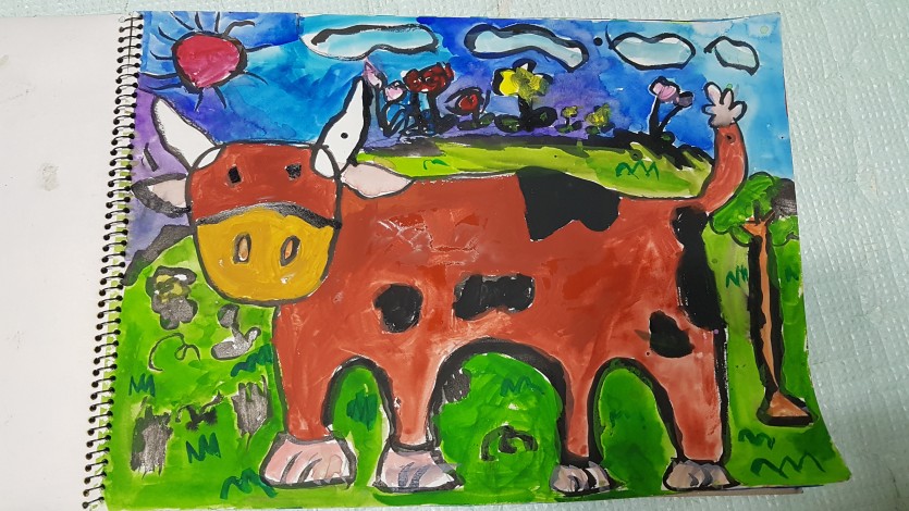 시골에서 보았던소~ 얼룩송아지 노래를 흥얼거리며 얼룩이 있는 송아지를 그렸습니다.