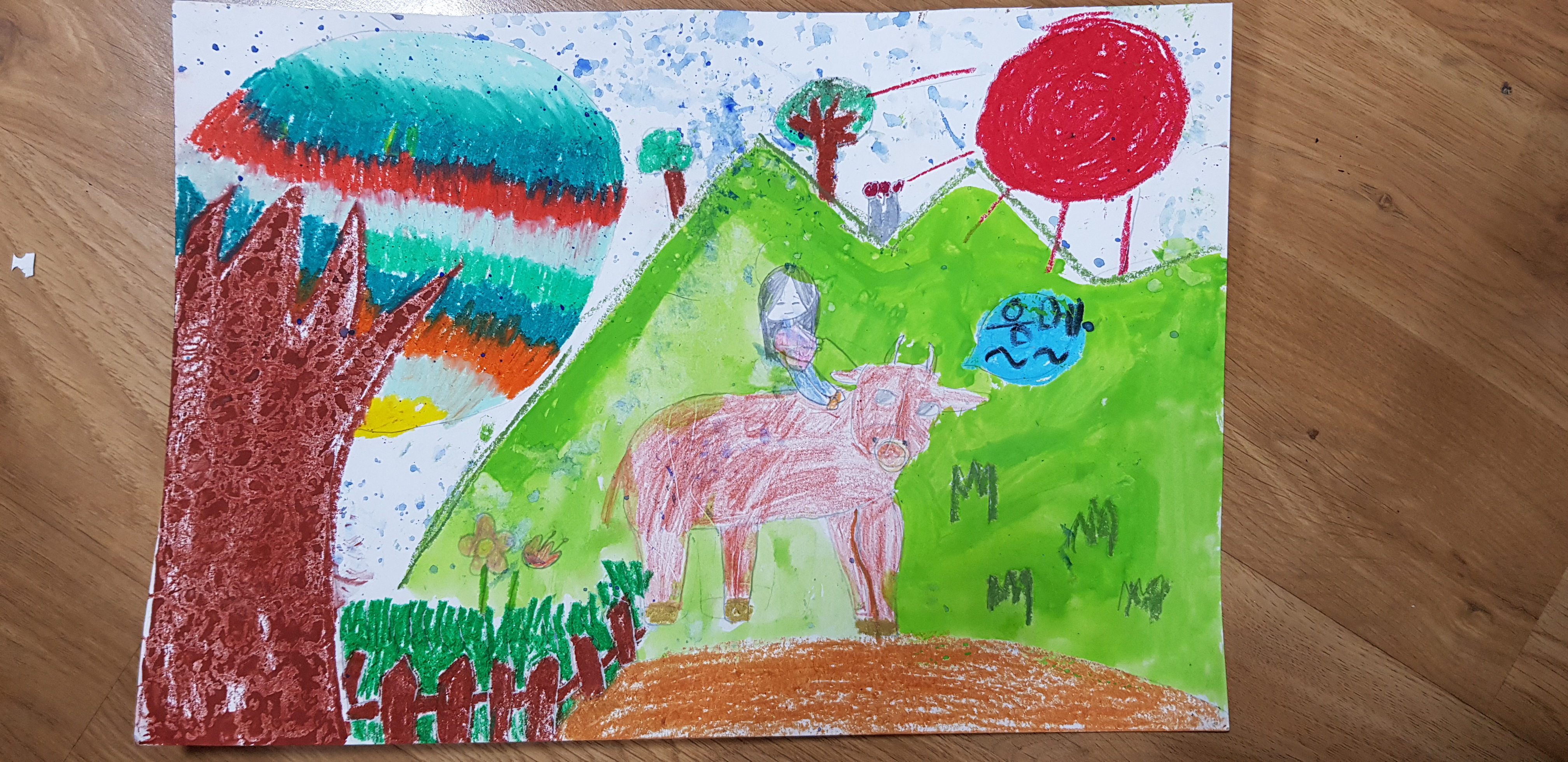 단풍 구경을 하고 싶어 풀밭에 나온 한우가 단풍으로 바뀐 산 앞에서 여물을 먹고 있는 모습이에요. 여물에서는 한우가 좋아하는 맛있는 냄새가 나고 있어요.