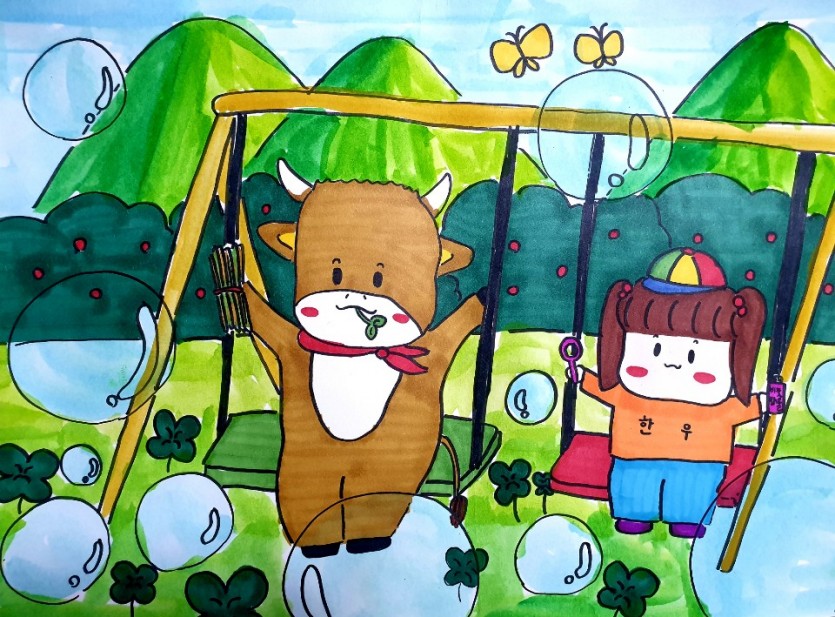 놀이터에서 함께 그네를 타며 즐겁게 놀고 있는 모습을 그린 그림입니다.