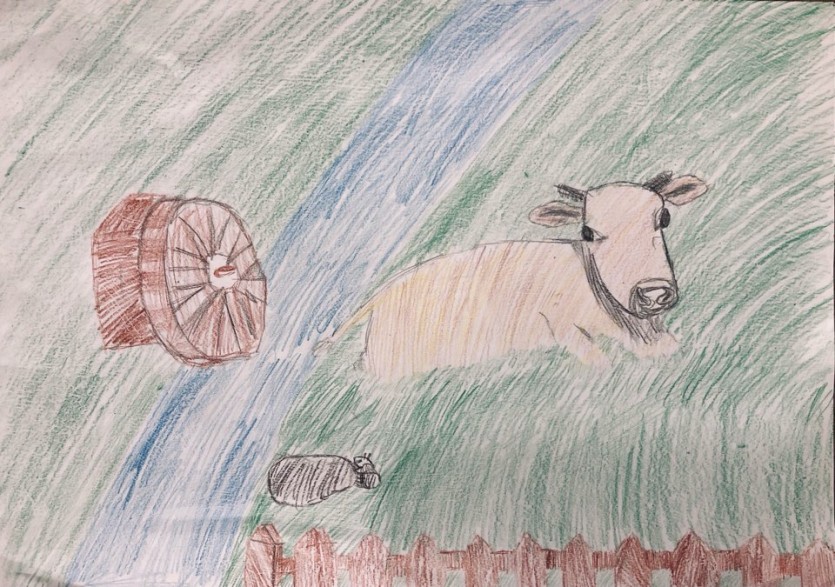 한우 한 마리가 느긋하게 울타리 바깥 풍경을 바라보고 있습니다. 방금 싼 똥을 쇠똥구리 한 마리가 굴리고 어디론가 가고 있습니다.