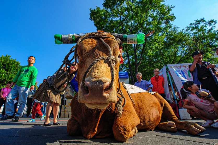 서울 시내에서 전통문화축제가 열려 콘크리트 도심에 한우가 나타나 축제 참가 시민들이