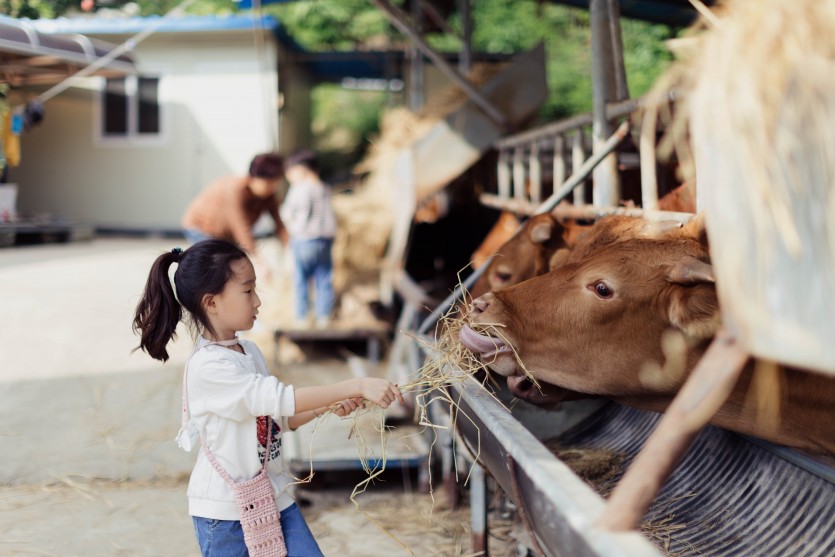 소에게 볏짚을 짚을 주니, 소가 혀를 낼름거리며 맛있게 먹는 모습입니다.