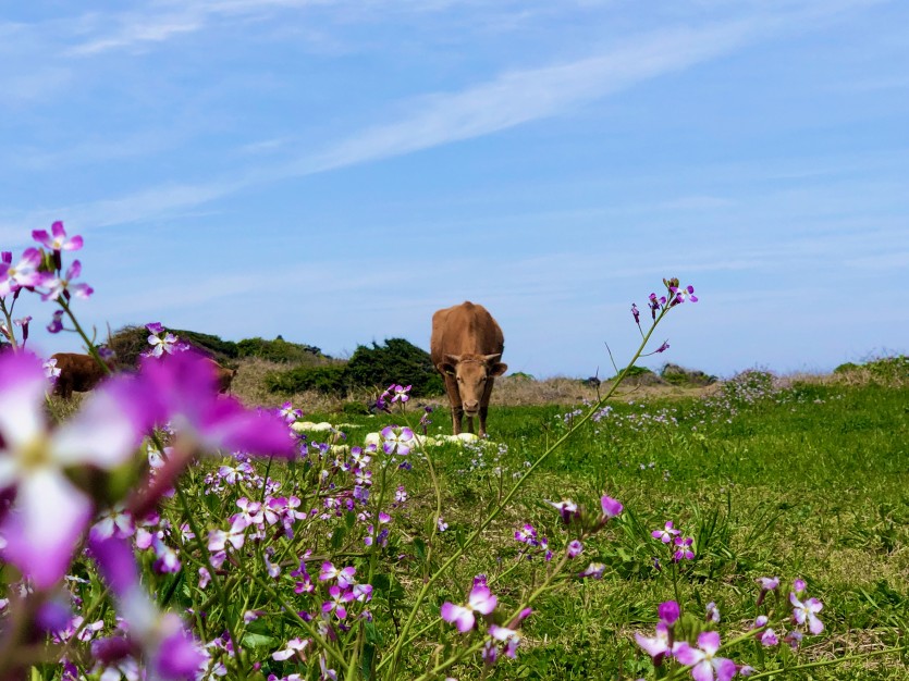 맑은 하늘 아래 꽃 구경을 하고 있는데