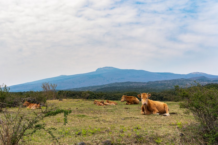한라산 인근 초지에서 쉬고 있는 황소가족