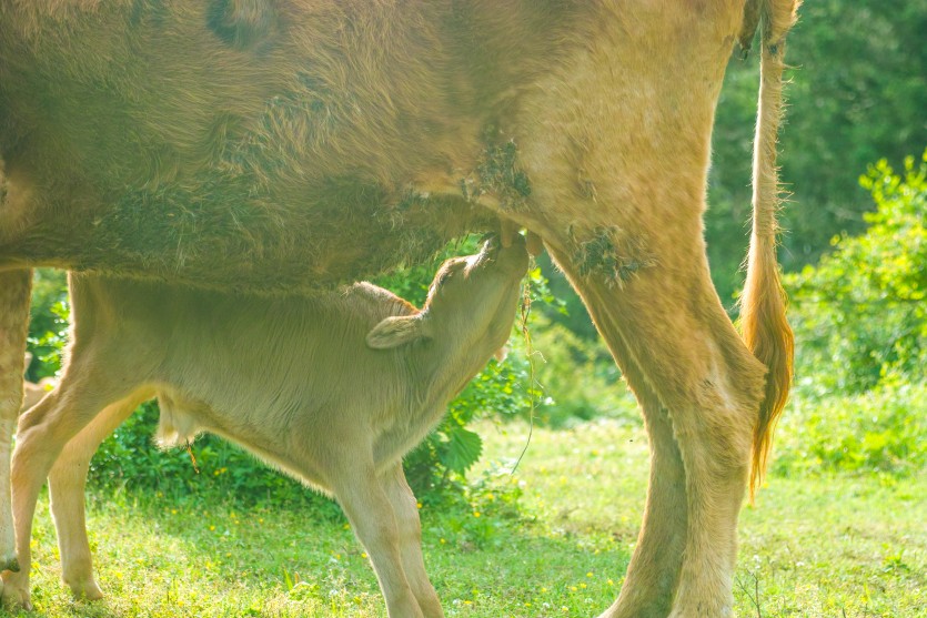 어미젖을 빠는 게 익숙치 않은 송아지 한 마리.